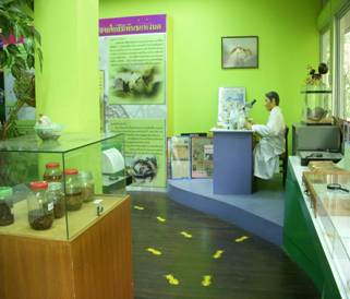 Kasetsart University Museum of Fisheries (Natural History), at the Faculty of Fisheries, collects samples of aquatic species, such as fish, reptiles, aquatic mammals and seaweeds, etc., along with some local fishing tools. The building is located in a pond. The spacious room is divided into exhibition section and collection section. Most exhibited samples are stuffed animals with informative posters giving scientific names, characteristics, habitats and food. Some samples are skeletons.