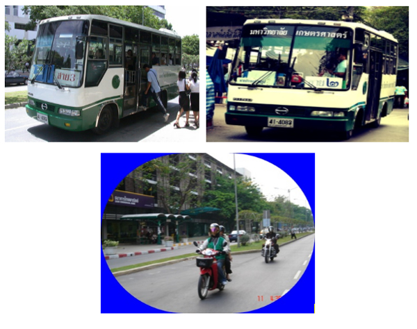 From Phaholyothin Road Gate and Ngamwongwan Road (Gate 1), take Kasetsart shuttle services # 2 (๒ in Thai ), or 3 (๓ in Thai) or take a motorcycle taxi (approx. 15 TBH). Get off where you see ISET2015 sign and the Office of Computer Service, the venue on your left. If you get off at Vipavadi Road, you have to take a motorcycle taxi to the venue (approx. 15 TBH)